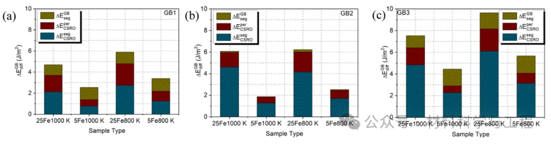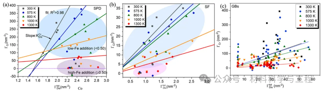 图 4. 不同温度下 (a) SPD 模型、(b) SF 模型和 (c) 所有 GB模型(包括 GB1、GB2 和 GB3)的铬元素过量化学吸收(ΓCr)与过量结构紊乱(Γtot Dis)的对比。尽管数据点有限且分散,但结果表明元素的异质分布与缺陷结构的无序性之间可能存在直接联系。对于 SPD 和 SF 模型,在低铁浓度模型中获得的数据标记为蓝色区域;在高铁添加模型中获得的其他数据标记为红色区域。详细的相关分析见补充材料 A.2.3 节。GBs 模型中较分散的数据点与不同类型的晶界有关,这些晶界源于三种不同类型的晶界:ATGB-GB1、STGB-GB2 和ATGB-GB3。