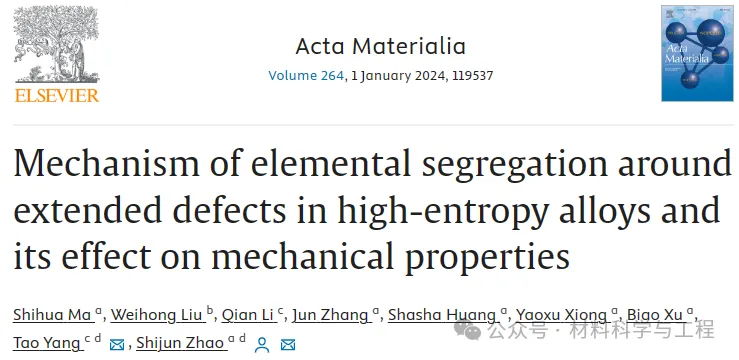 扩展缺陷,包括位错、堆积断层(SF)和晶界(GB),对工程合金的性能起着重要作用。在实践中,这些缺陷容易造成元素偏析,即局部成分浓度增加,这可能会从根本上改变材料的机械性能。对于由高浓度多种主要元素组成的高熵合金 (HEA),研究表明,扩展缺陷周围的化学偏析比传统合金更为明显,会严重影响其机械性能,如脱粘和断裂。在由多主元素组成的高熵合金(HEAs)中,围绕扩展缺陷的元素偏析很常见,这会严重影响其机械性能。在高熵合金中,偏析的驱动力通常与化学短程有序(CSRO)的形成相竞争,这使得阐明偏析机制具有挑战性。