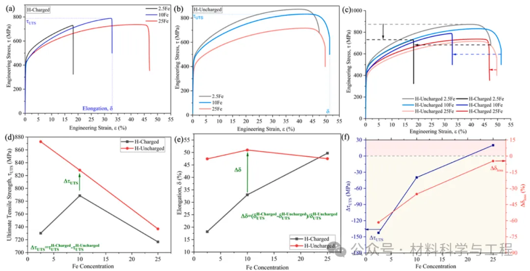 图 7. 三种合金在 (a) 充氢和 (b) 不充氢状态下的工程应力-应变曲线。(c) 充氢前后的应力应变曲线对比。(d) 充氢前后极限抗拉强度(τUTS)和(e)伸长率(δ)随铁浓度的变化。(f) 加氢后不同合金的伸长率损失率和极限拉伸强度降低率。