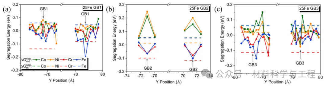 图 9. n/Co(n=Ni、Cr、Fe)、n/Ni(n=Co、Cr、Fe)、n/Cr(n=Ni、Co、Fe)和 n/Fe(n=Co、Ni、Cr)的置换能,以及它们在 25Fe (a) 块体和 (b) GB2 位点中沿 y 方向的平均值。物种 m 的平均置换能是 m 被 n 替代时的平均能量变化(n≠m)。例如,Co 表示 Ni/Co、Cr/Co、Fe/Co 的平均能量。(c) 25Fe 中 GB 与主体(GB-Bulk)平均取代能之间的取代能差。