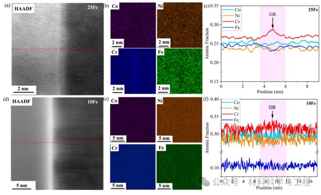 图 3. 25Fe 和 10Fe 合金中 GB 周围的元素分布。(a) 25Fe 和 (b) 10Fe HEA 中 GB 的高角度环形暗场 (HAADF) 图像,以及 (b,e) 相应的 EDS 图谱。(c,f) GBs 上相应的元素分布图。