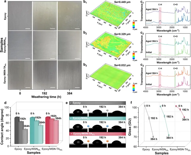 图5.不同涂层在风干过程中的形貌,化学结构,润湿性和光泽度变化。(a)耐风干实验前后不同涂层的数码图片(比例尺:5mm); (b1)空白环氧涂层(b2) EP/MSN5%涂层和(b3) EP/ MSN-TA5%涂层经过384h的风干实验后的表面形貌和表面粗糙度;(c1)空白环氧涂层(c2) EP/MSN5%涂层和(c3) EP/MSN-TA5%涂层384 h耐风干的FTIR光谱分析; (d)不同涂层的水接触角变化及(e)对应图像; (f)不同涂层的光泽度值的变化(误差条代表三个独立样本的标准差)。