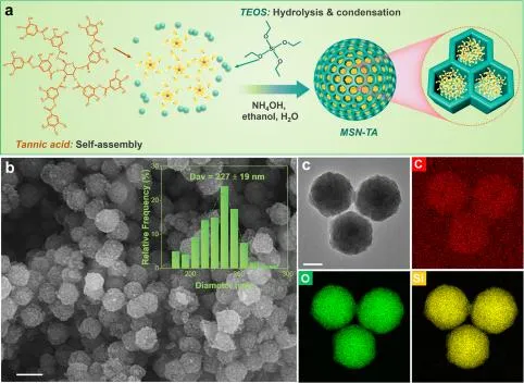 MSN-TA纳米容器的制备图如图1a所示。在碱性条件下,TA分子自组装成致孔剂31,通过TEOS的水解缩聚形成MSN壳层32。通过SEM和TEM对制备的MSN-TA纳米容器的形貌进行了表征,如图1b,c所示,纳米颗粒分布均匀,接近球形,粒径分布较窄,平均直径~227nm。 MSN-TA纳米容器的元素分布通过能谱图(EDS)表征,如图1c所示。Si元素映射结果勾勒出了MSN的结构。碳元素的能谱图表明TA负载成功。同时,氧元素的分布可以归因于介孔二氧化硅结构和负载的TA分子。
