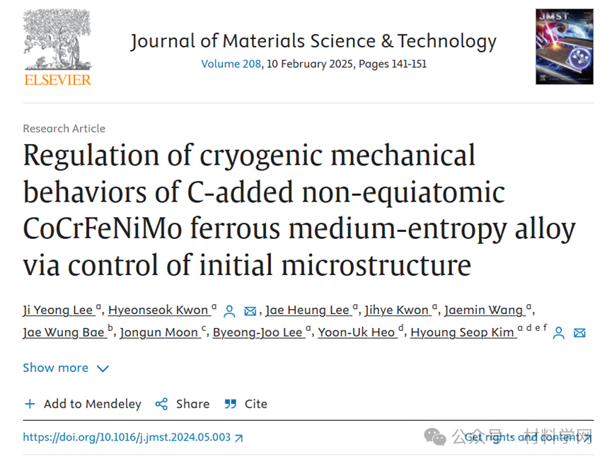 相关研究成果以“Regulation of cryogenic mechanical behaviors of C-added non-equiatomic CoCrFeNiMo ferrous medium-entropy alloy via control of initial microstructure”发表在Journal of Materials Science & Technology上