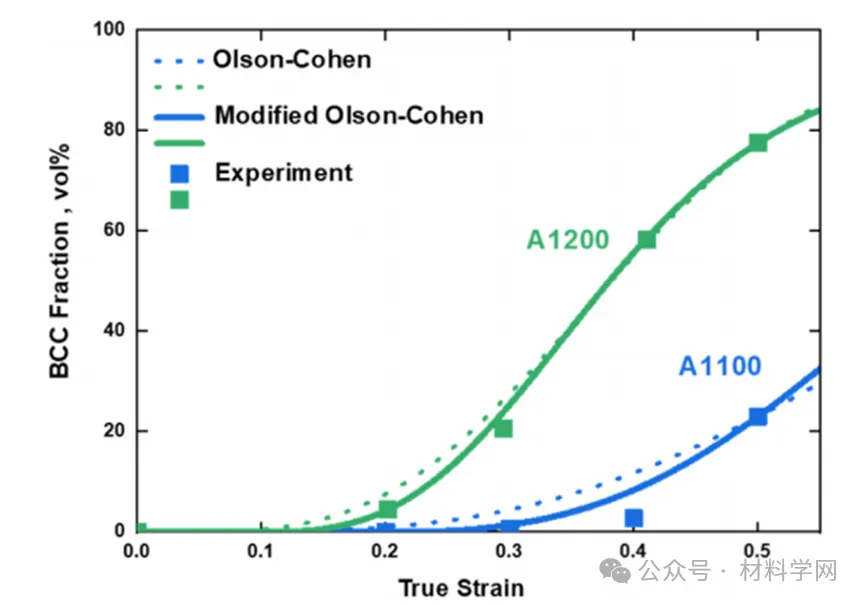 图12 BCC组分演变的原始和修改的 Olson-Cohen 模型以及与实验数据的比较。