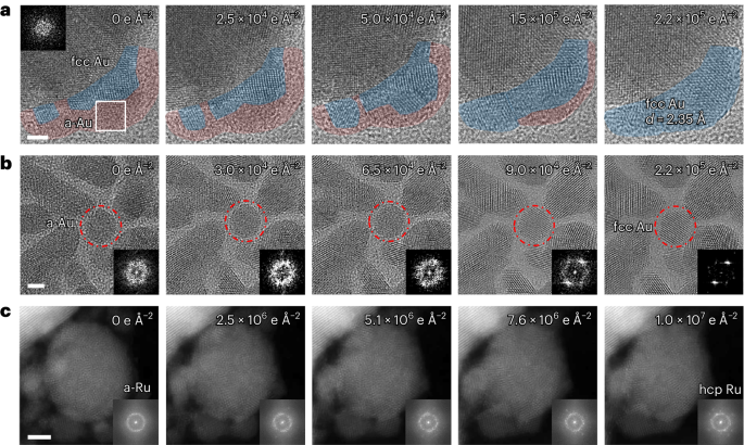 观察到金MMG的非晶区域在电子束照射下转变为晶体结构,为了解玻璃化金属的稳定性和转变机制提供了见解(图2)。图2a显示了电子辐照期间Au MMG中非晶区域从无序到有序的转变。微晶沿着边界外延生长,使得非晶区耗尽并与结晶区合并。由于高电压和足够电子剂量的照射,大多数非晶金(a-Au)区域(以红色标记)转变为面心立方金晶体(以蓝色标记)。聚结还表明非晶区域是纯金。在单个Au(图2b)和Ru MM GNP(图2c)上观察到类似的转变。这些玻璃到晶体的转变证实了单一的金和钌金属通过该方法被玻璃化。