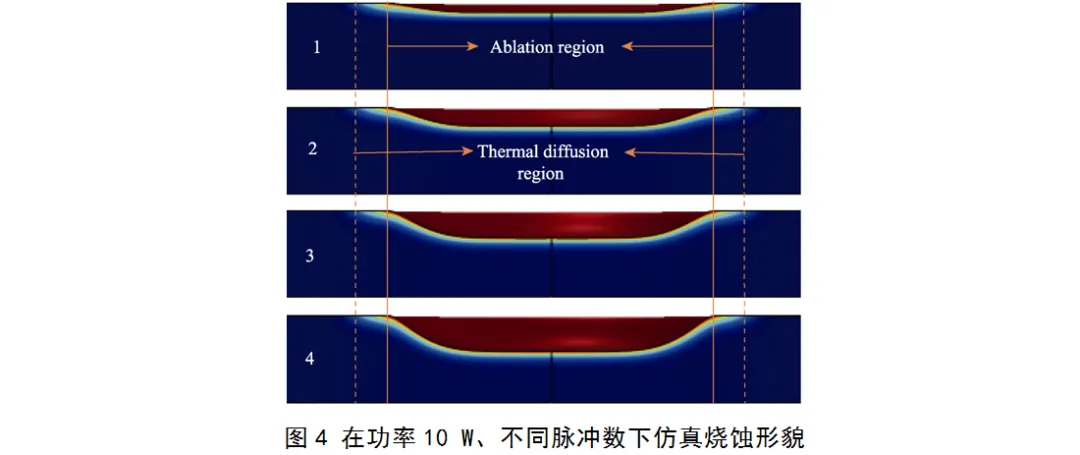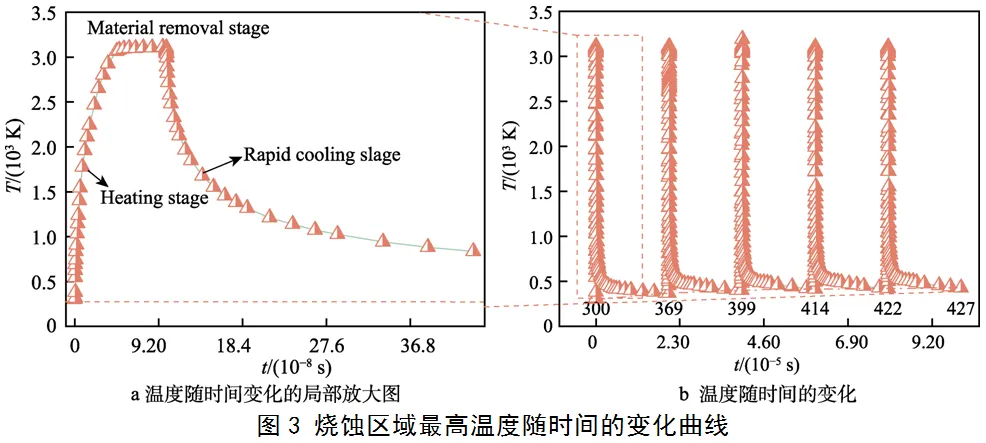 为了简化仿真计算,采用定点烧蚀方式对水导激光加工SiC的温度场进行仿真数值模拟,烧蚀区域内最高温度随时间的变化趋势仿真情况如图3a所示。在加热阶段初期,温度迅速上升,随着加热的进行,最高温度逐渐趋于平稳。这是由于材料表面能量向基体内部能量扩散,抑制了表面温度的上升速率,使得材料在去除阶段的表面温度基本保持恒定;在快速冷却阶段,加工区域在水射流强制对流换热、材料内部热传递及空气对流的共同作用下迅速冷却。随着冷却时间的延长,靶材表面的温度及温度梯度减小,抑制了材料内部热扩散量和表面对流热损失,故材料仍然存在热量残余,脉冲强度的重复导致表面残余温度持续上升,温度的增加量随着脉冲不断叠加逐渐减小。