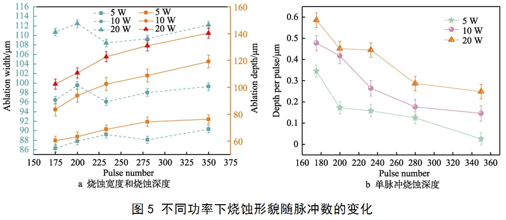 在功率10 W、不同脉冲数的作用下,SiC烧蚀形貌如图4所示,随着脉冲的叠加,SiC烧蚀直径与热扩散区域基本不发生变化,烧蚀深度逐渐增加。可见,在保证激光其他参数不变的条件下,保持激光功率不变时,SiC多脉冲水导激光烧蚀直径基本恒定。在激光功率与脉冲数的共同作用下,SiC烧蚀宽度和烧蚀深度的变化趋势如图5a所示。在激光–水射流复合加工过程中,随着激光功率密度的增加,所形成的等离子体的密度会不断增加,热阻塞效应会加剧,相应材料所吸收的激光能量会减弱。在激光–水射流复合加工过程中,随着激光功率密度的增加,所形成的等离子体的密度会不断增加,热阻塞效应会加剧,相应材料所吸收的激光能量会减弱。