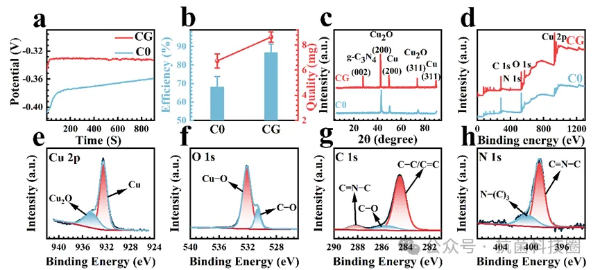 电沉积电位(a)和效率与质量(b),XRD图谱(C),XPS测量光谱(d),镀层中Cu 2p (e),O 1s (f),C 1s (g),N 1s (h)的XPS光谱