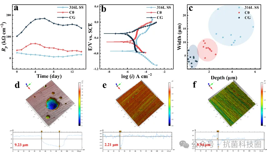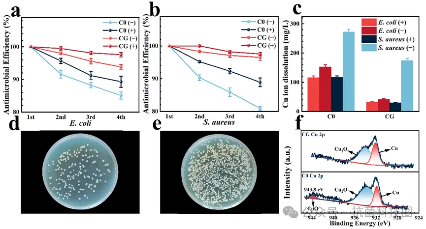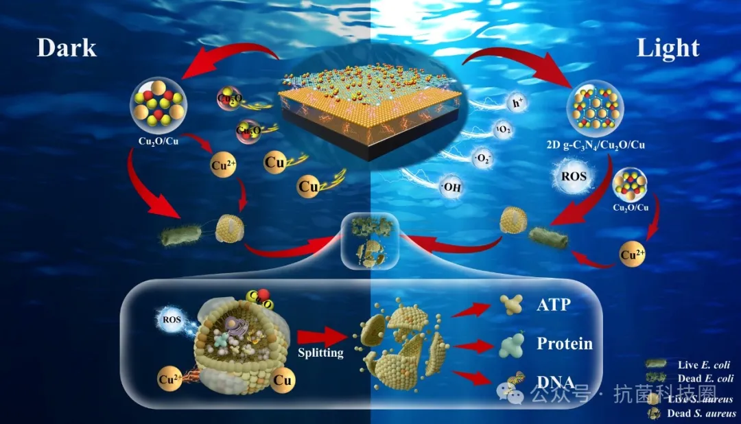 微生物腐蚀是金属材料腐蚀失效的主要原因之一,会造成巨大的经济损失。Cu2O作为一种有效的光催化抗菌涂层有望成为微生物腐蚀的解决方案。然而,光腐蚀和电荷分离效率低等缺陷限制了其应用。基于此,河北科技大学李建辉教授团队成功合成了一种新型高效抗菌g-C3N4/Cu2O/Cu涂层。 2D g-C3N4超薄多孔结构为Cu2O和Cu沉积提供了充足的活性位点,提高了电流效率,同时增强了光吸收和电子传输能力。此外,2D g-C3N4和Cu2O/Cu之间形成S型异质结可有效抑制Cu2O光腐蚀。 值得注意的是,由于铜离子的协同杀菌作用和活性氧的产生,该涂层在光照和黑暗条件下都能在1小时内快速杀灭大肠杆菌和金黄色葡萄球菌。同时,该涂层对铜绿假单胞菌引起的316L不锈钢微生物腐蚀具有显著的抑制作用。