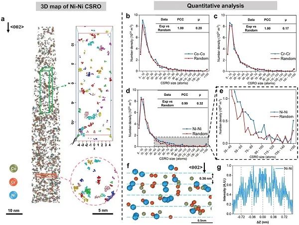图4、退火CoCrNi合金中沿<002>方向分布的CSRO的3D定量分析结果。(a) Ni-Ni CSRO的3D分布及元素映射。 (b), (c), (d) 分别为识别出的Co-Co、Cr-Cr和Ni-Ni CSRO的尺寸分布。结果与化学随机化数据集进行比较,并用Pearson相关系数(PCC)和Pearson列联系数(µ)进行分析。 (e) (d)中区域的局部放大。(f) 从(e)中提取的典型Ni-Ni CSRO域的3D原子图。(g) 其对应的Ni-Ni z-SDM。