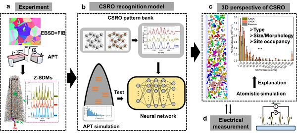 在固体材料中,化学短程有序(CSRO)指的是某些特定种类的原子自发地占据特定的晶体位置。近年来,CSRO被视为调控材料力学性能和功能特性的新途径。然而,材料性能与CSRO结构的形态、数量密度以及原子排列之间的定量关系仍然难以把握。对此,李跃团队展示了如何利用机器学习增强的三维原子探针技术(APT)来深度挖掘接近原子分辨率的APT数据。结合APT技术的高元素灵敏度,该团队提供了对CoCrNi熵合金中CSRO的三维定量分析。研究揭示了多种CSRO配置,并通过先进的蒙特卡罗模拟验证了这些配置的形成机制。利用获得的CSRO定量结果,团队建立了加工参数与物理性能之间的关联。这一精确的三维表征将有助于通过操控原子尺度的结构来实现先进材料的设计。