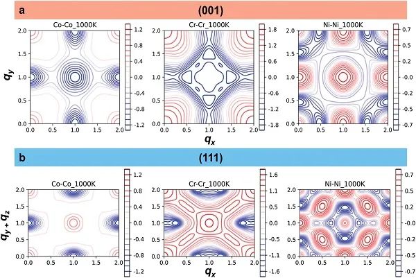 图6、蒙特卡罗模拟预测的CSRO。(a) 和 (b) 分别为在1000K下Co-Co、Cr-Cr和Ni-Ni对在(001)和(111)平面中的预测CSRO弥散强度图α_q。倒易空间向量以2π/a为单位表示,其中a是晶格参数。