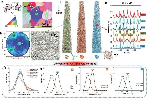图2、CoCrNi合金在1273K退火120小时后的典型APT数据及其常规数据分析方法。(a) EBSD图突出了用于APT实验的晶粒。(b) 代表性的二维探测器命中图。 (c) 沿<002>方向的精确三维APT重构图。(d) (c)中沿<002>方向的一个薄切片的局部特写。(e) (c)中一个代表性体素中不同元素对的z-SDM图。其特征对应于面心立方(fcc)结构。两种传统的APT分析方法:(f) Co、Cr和Ni原子的频率分布分析,与二项式随机分布进行比较;以及(g) Co-Co、Cr-Cr和Ni-Ni元素对的k最近邻距离分析(k=1和5)。