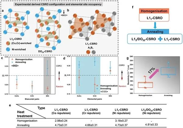 图5、不同热处理下CoCrNi合金中多类型CSRO的3D原子级细节及其引起的电阻率变化。(a) 具有{100}平面上Ni-Ni排斥的L12/DO22-CSRO结构。(b) 具有{111}平面上A-A或B-B排斥的L11-CSRO结构。元素A或B指代富含Co、Cr或Ni的位点,但不能同时是相同的元素。(c) 和 (d) 不同热处理下沿<002>和<111>方向的µ的变化。彩色区域突出了退火后µ值的变化。分析了三个APT数据集,以获得每个数据点的统计结果。µ=0.25被认为是CSRO与随机状态之间的阈值。(e) 热处理下不同类型CSRO的数量密度变化(×1025 m−3)。(f) 从均匀化到退火过程中CSRO结构的演变,图(a)和(b)中绘制了相应的CSRO配置。(g) 不同热处理下电阻率的演变。