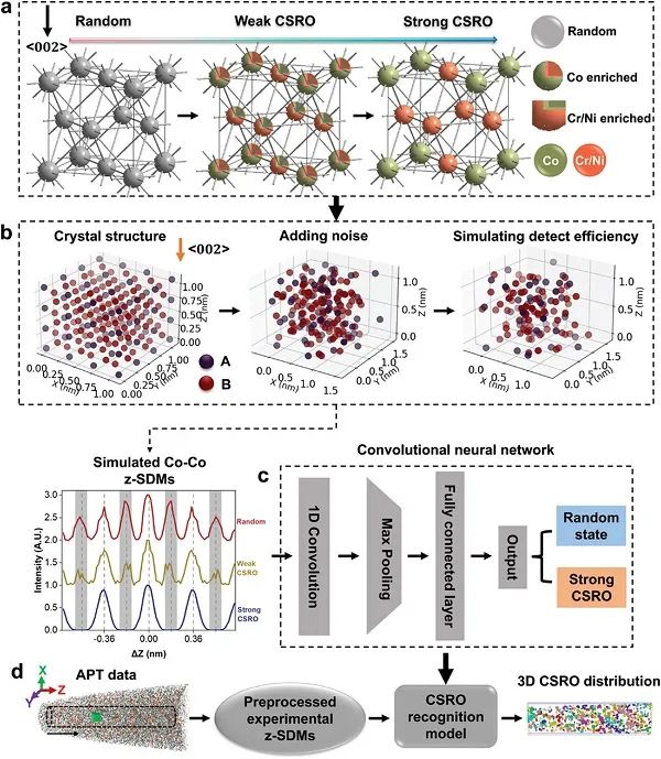 图3、ML-APT框架用于识别CoCrNi合金中的多类型CSRO流程图。(a) 随机面心立方(random-fcc)、弱L12-CSRO和强L12-CSRO的晶胞。(b) 在执行APT模拟后,沿<002>方向显示的典型Co-Co z-SDMs,表示CSRO的演变。(c) 优化的一维卷积神经网络(1D CNN)结构示意图,用于获得随机面心立方/CSRO识别模型。(d) 处理实验数据以获得3D CSRO分布的流程图。