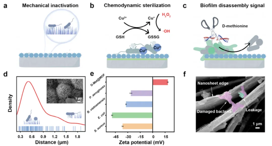 该研究开发了一种通用的螯合定向策略,用于在环境条件下合成坚固的基于手性MOF的防生物污染涂层。通过MPN的生物激发聚合和原位D-氨基酸集成矿化,将所得涂层设计成无定形/晶体异相结构。由单宁酸(TA)、聚乙烯亚胺(PEI)和Cu2+组成的MPN不仅通过模仿贻贝足蛋白的凝固过程赋予了不依赖表面的锚定能力,而且还具有丰富的成核位点,可以有效地固定MOF。 该研究提出,对三元组成的精确控制能够解决与快速和不受控制的Schiffbase/Michael加成反应相关的严重聚集和生长不良的问题。D-氨基酸作为功能有机亚基固定在中间粘附层上,与Cu2+周期性地组装成MOF纳米材料。这种结构骨架提供了一种概念上不同的方式来增强D-氨基酸的物理化学稳定性和发挥其生物学特性。 更重要的是,局部手性微环境可以与抗菌元素位点协同作用,获得前所未有的抗生物污染性能,提供对细菌和藻类的广谱抗性,抑制生物膜的形成,并根除成熟的生物膜。系统实验和RNA测序转录组学分析表明,独特的抗生物污染途径包括纳米结构的机械杀菌作用、高毒性羟基自由基(·OH)引起的DNA氧化损伤、手性依赖的生物膜调节和荧光诱导的藻类治理。 该研究提供了一个具有“即配即杀”特征的协同防污模式的范例,并揭示了高度自适应手性MOF衍生涂层在抗菌、抗感染和其他涉及生物膜的生物医学领域的潜在应用。