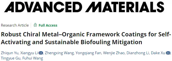 表面涂层旨在减轻普遍存在的生物污损,预示着复杂生物环境中表面保护的新时代已经到来。然而,尽管使用了杀菌剂,现有策略仍受到持续和反复出现的生物膜附着问题的困扰。 2024年9月5日,东北大学王福会教授、徐大可教授(2024年度国家杰出青年科学基金获得者)、李祥宇副教授团队在Advanced Materials期刊发表题为“Robust Chiral Metal–Organic Framework Coatings for Self-Activating and Sustainable Biofouling Mitigation”的研究论文,东北大学材料学院于智群为论文第一作者,李祥宇副教授、徐大可教授为论文共同通讯作者。https://onlinelibrary.wiley.com/doi/10.1002/adma.202407409 该研究发了一种手性金属有机框架(MOF)涂层,该涂层具有保形微结构,可实现一种新的防生物污损模式,即自发生物膜分解后消灭细菌。 手性MOF的防生物污损涂层示意图 图源:Advanced Materials