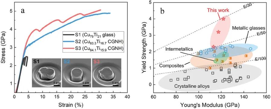 日前,来自中国科学院力学研究所和中科院物理所等单位的研究人员,设计了一种组合方法来构建包含不同成分、微观结构和机械性能的Cu-Ti合金库,从而能够有效地识别具有前所未有的3.8 GPa屈服强度和高变形能力的铜合金。这种特殊性能归因于由纳米晶粒、纳米孪晶和非晶相组成的晶体玻璃纳米异质结构(CGNH)。超高强度源于结构单元细化的极端强化,以及避免了因纳米晶粒之间非晶相的夹杂导致的晶界滑动而引起的软化。显著的变形能力与纳米非晶相中均匀流动的激活有关,并辅以协调的纳米晶体旋转。CGNH结构为克服合金强度和变形能力之间的权衡提供了一条有效的途径。