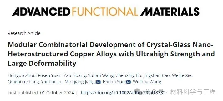 相关工作以“Modular Combinatorial Development of Crystal-Glass Nano-Heterostructured Copper Alloys with Ultrahigh Strength and Large Deformability”为题发表在Advanced Functional Materials上。