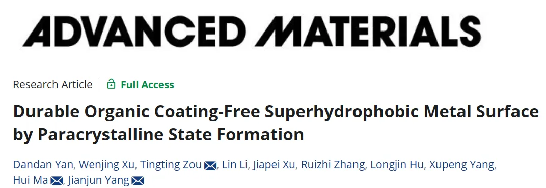 本研究创新性地利用飞秒激光元素掺杂与循环退火相结合的加工处理技术,打造出无需有机涂层也可实现持久保持的超疏水金属表面。 该表面独具稳定储存空气结构、低自由能及高化学稳定性等三种功效,其关键在于微纳结构本身具有次晶相态,从而自主有效地降低了表面能,颠覆了唯有依赖有机物修饰才能获得超疏水性能的传统观念。 此三位一体的功能设计避免了有机改性剂的缺陷,有效解决了金属表面极端拒水性持久保持的关键难题,这一突破不仅为超疏水领域开辟了广阔的前景,还为基于原子尺度调控的高性能材料表面设计与开发提供了全新的研究思路。本论文的第一作者为长春光机所博士生闫丹丹,沈阳金属所博士徐文静,通讯作者为长春光机所杨建军研究员,邹婷婷助理研究员和沈阳金属所马会副研究员。