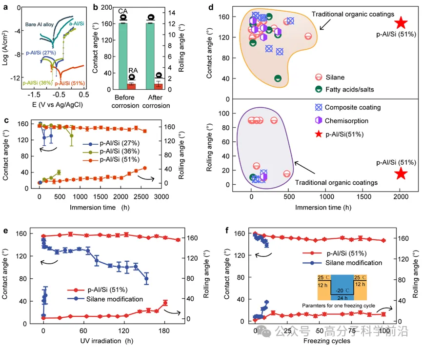采用多种苛刻环境,对次晶相态导致的本征超疏水金属表面的持久性能进行了测试,结果如图4所示。在3.5wt.% NaCl腐蚀溶液中的电化学测试表明,基于次晶相态的材料耐腐蚀性显著优于非晶和未加工铝合金,其中p-Al/Si(51%)样品的耐腐蚀性尤为突出,其腐蚀电流密度降低了105倍,且测试后的超疏水性能依旧保持完好(接触角为161°,滚动角为1.5°)。 随着次晶相态形成占比的提升,样品表面的化学稳定性也逐步增强,尤其是p-Al/Si(51%)样品在3.5 wt.% NaCl溶液中浸泡长达2000小时后,仍能保持优异的拒水性,且表面形貌完好无损。分析认为这种出色的超疏水保持性能主要来源于次晶相态的形成,并能够通过减小非晶态的自由体积来阻碍侵蚀离子的渗透。 此外,根据变形电荷密度的计算结果,次晶相态的形成还将导致铝原子周围的电子密度下降,进而削弱了铝的反应活性。并且,Si元素的加入不仅可以促进次晶相态的形成和稳定,还助力生成具有防腐性能的铝硅酸盐物质,这也是其化学稳定性提升的另一重要因素。值得一提的是,p-Al/Si(51%)样品在紫外线照射下的环境适应性也远超传统的硅烷涂层,其性能较后者提升高达336倍。在从室温至-20℃的循环冷冻测试中,样品表面超疏水性能同样得到了很好的保持。