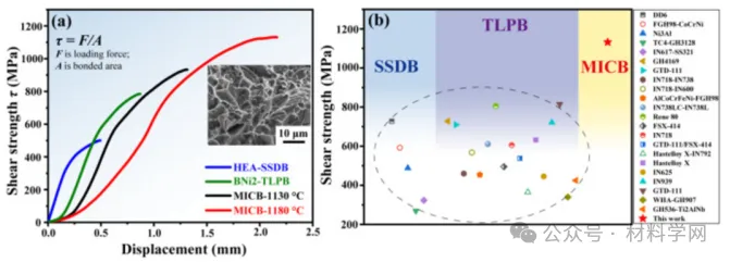 (b)我们研究的DB接头与各种高温合金或HEAs的抗剪强度比较。