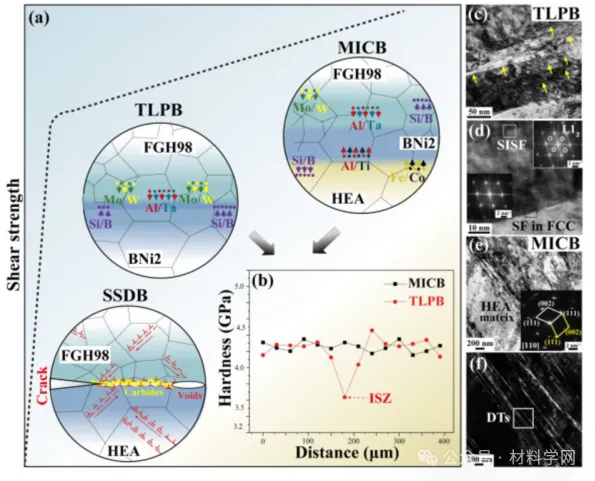 导读:在制造具有精密和复杂内腔结构的粉末冶金(PM)高温合金高性能涡轮盘时,带中间层的扩散键合(DB)是备受追捧的技术。采用夹层结构的“BNi2/高熵合金(HEA)/BNi2”夹层与PM高温合金FGH98结合,设计了多层复合键合(MICB)方法。MICB超高抗剪强度和优异的延性,呈现出典型的韧窝延性断裂模式。由于液态BNi2中间层的引入,消除了初始结合界面,代之以新生晶界(GBs),防止了界面脆性断裂。HEA箔的加入降低了接头的层错能(SFE),有利于变形孪晶(DT)的形成。因此,在变形过程中,γ'纳米颗粒和层错(SFs)、LomerCottrell (L-C)锁、DT、9R相等多个亚结构增强了加工硬化能力,强化了接头。同时,在整个变形过程中,DT的增殖和相互作用诱发了动态再结晶(DRX)的软化机制,并在塑性失稳发生时占主导地位,形成了大量由γ/γ'纳米带组成的绝热剪切带(ASB),表明节理的延性得到了显著提高。