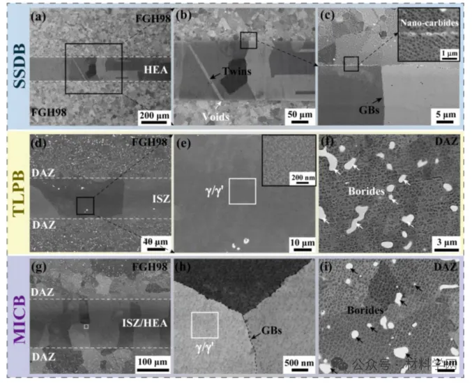 FGH98合金在相同的连接条件下,采用三种不同的连接方式进行扩散连接:(1)HEA箔的固态扩散连接(SSDB), (2) BNi2中间层的瞬态液相连接(TLPB),以及(3)“BNi2/HEA/BNi2”中间层的夹层结构(在MICB过程中BNi2熔化,HEA保持固态)。这些DB方法产生了三种独特的关节形态,如图2所示。在SSDB接头中(图2 (a)),初始键合界面仍然可见。由于FGH98合金的高热相稳定性和HEA导致的状态扩散,缓慢的原子扩散导致结合质量有限,显示出残留的界面缺陷,如空洞和纳米碳化物(图2 (b, c))。然而,在TLPB和MICB过程中,熔点抑制剂(MPD,即Si/B)在BNi2中间层中的扩散促进了近界面区域的重熔和凝固,用新生的gb取代了初始界面(BNi2/FGH98或BNi2/HEA之间)(图2 (d, g))。在MICB接头中,尽管添加了3个夹层(引入4个初始界面),但未观察到键合界面。