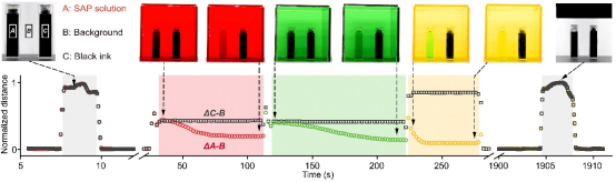接下来的三年里,王东升经历了提出理论、设计材料、实测结果、验证理论等过程。其中,他花了一年多的时间,把分别吸收不同颜色的多种DASAs分子进行组合配比,完成稳定且可复制的制备方式,使最终合成的SAP材料能够在绿色、黄色和红色的光线照射下,变化出相应的颜色。
