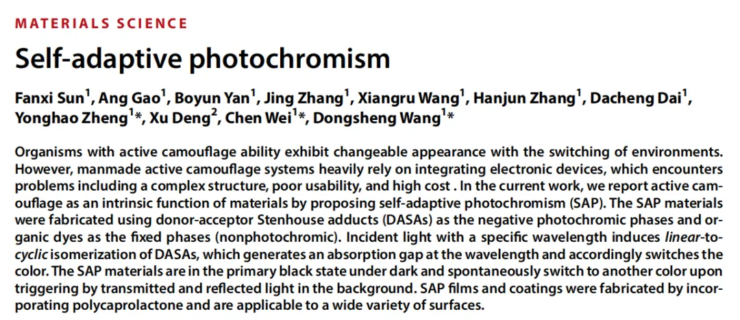 尽管材料本身没有神经系统,但一种名为给体-受体斯坦豪斯加合物(DASAs)的光致变色分子却发挥了关键作用。DASAs能在可见光照射下从有色变为无色。王东升及其团队利用独特的匹配原理,将不同种类的DASAs分子巧妙融合成一种新型材料。