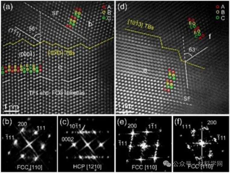 原子尺度的高角度环形暗场扫描透射电子显微镜(HAADF-STEM)图像以及相应的快速傅里叶变换(FFT),展示了面心立方(FCC)结构和六方密堆积(HCP)结构之间特定取向关系的形成情况,分别源自剩余的{101}孪晶界(a - c)以及{103}孪晶界(d - f)