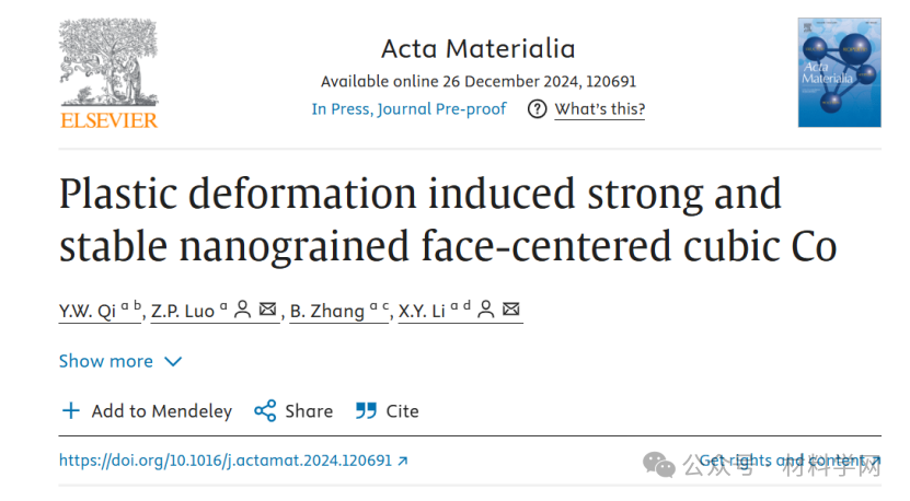 相关研究成果以“Plastic deformation induced strong and stable nanograined face-centered cubic Co”发表在Acta Materialia上