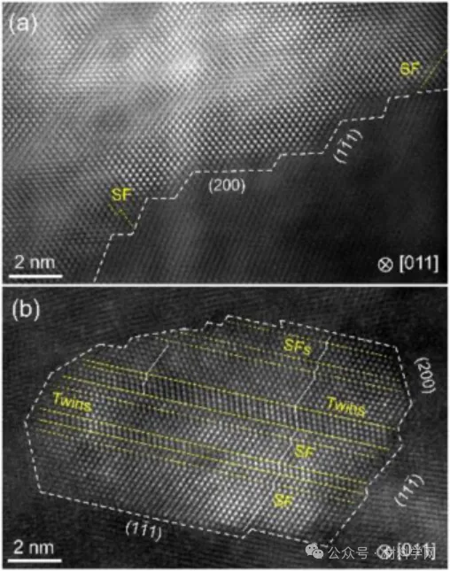 图9. 分别通过双层孪晶缺陷(a)和I2SFs(b)形成面心立方(FCC)相的机制示意图。