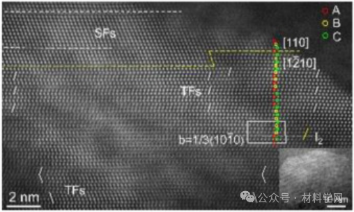 图4展示了来自NC - 11样品中尺寸约为30纳米的一个纳米晶粒(见插图)的密排六方(HCP)/面心立方(FCC)界面区域的扫描透射电子显微镜(STEM)图像。