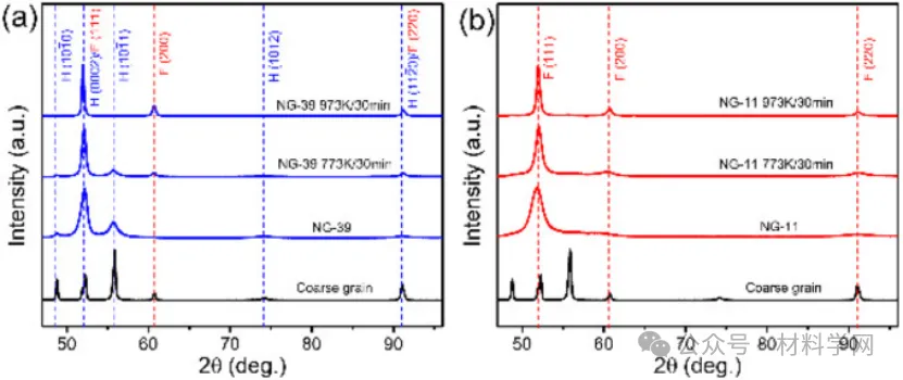 (b)NG - 11样品在不同温度退火前后的X射线衍射(XRD)图谱。H和F分别表示对应密排六方(HCP)结构和面心立方(FCC)结构的衍射峰。