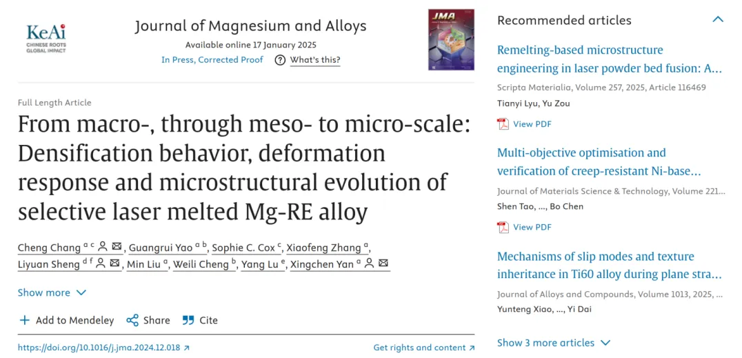 相关研究成果以“From macro-, through meso- to micro-scale: Densification behavior, deformation response and microstructural evolution of selective laser melted Mg-RE alloy”发表在Journal of Magnesium and Alloys上