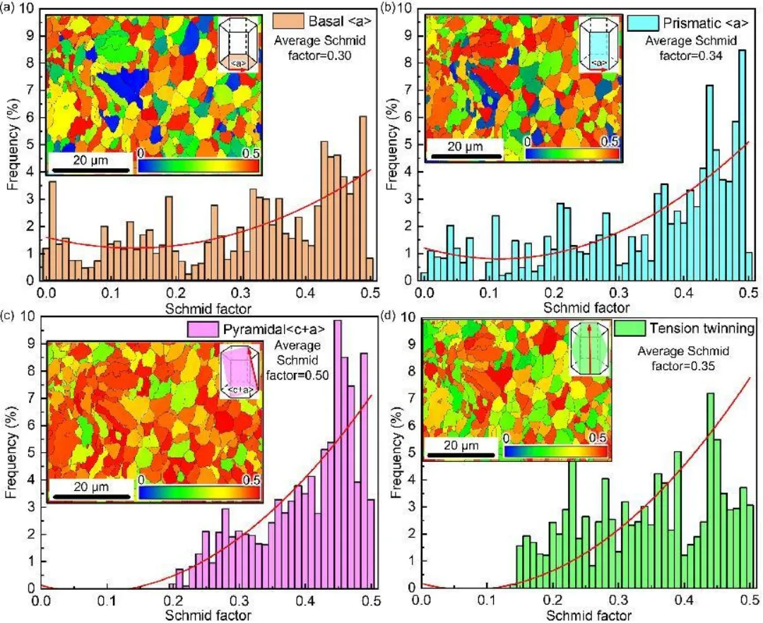 图5 SLM WE43样品不同变形机制下的SF统计:(a)基底<a>;(b) 棱柱形<a>;(c) 金字塔<c+a>;(d) 紧张结对。滑动面突出显示,Burgers矢量由红色箭头显示。