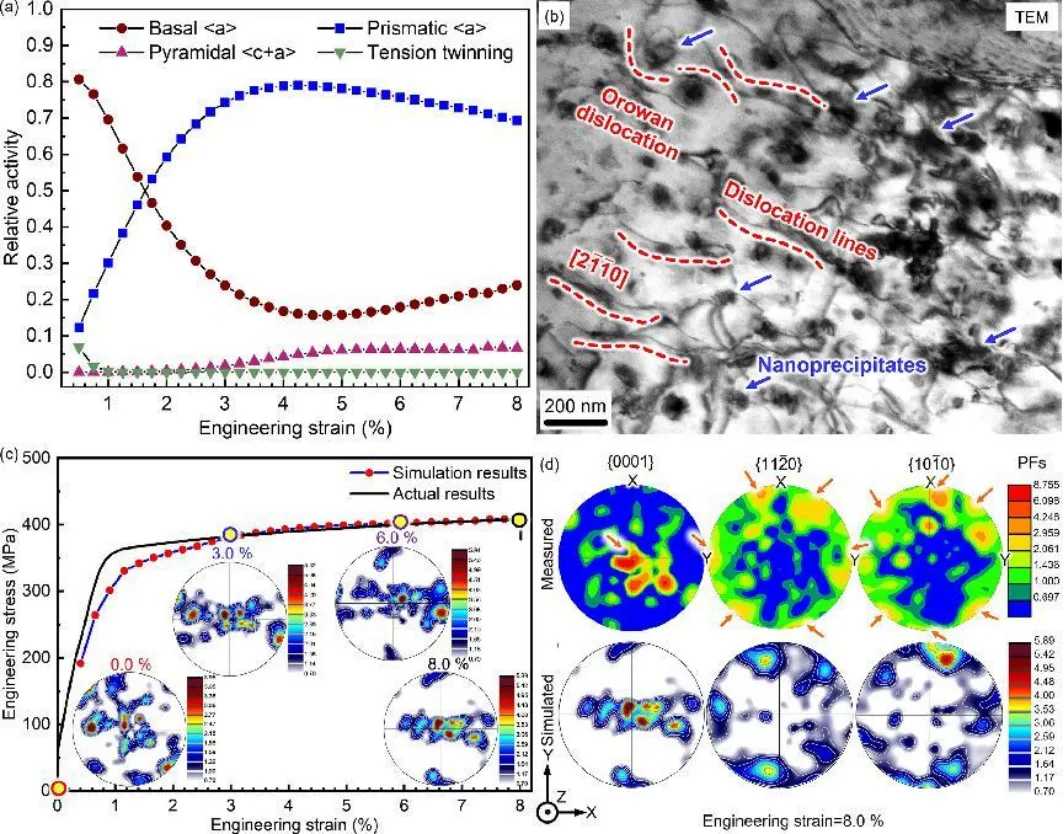 (2)通过VPSC模型和TEM表征证实,该合金的塑性变形行为主要由基面<a>和棱柱面<a>滑移驱动。变形前样品微观结构以随机织构为主(MUD=3.95),变形过程中晶粒逐渐向Z轴排列,断裂后呈现{0001}<10-10>的取向趋势(MUD=8.755)。