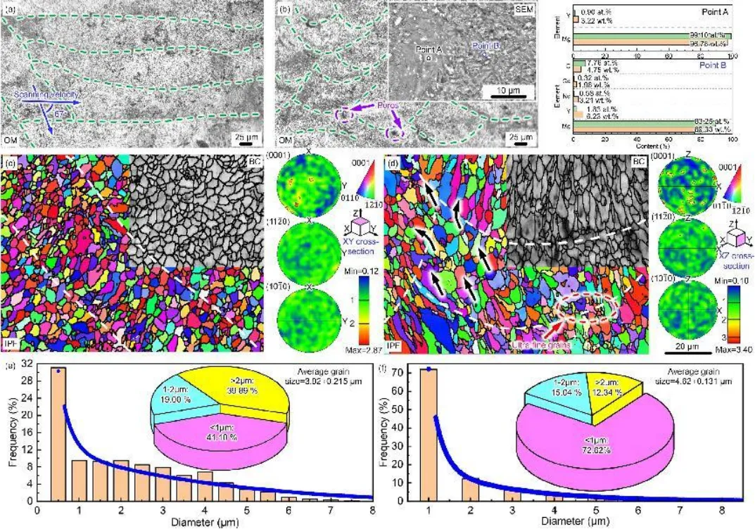 图9 SLM WE43样品在不同XY横截面下的典型微观结构:(a)OM;(c) IPF中插入了BC和PF;(e) 粒度分布;XZ截面下:(b)OM,局部SEM视图;(d) IPF中插入了BC和PF;(f) 粒度分布。