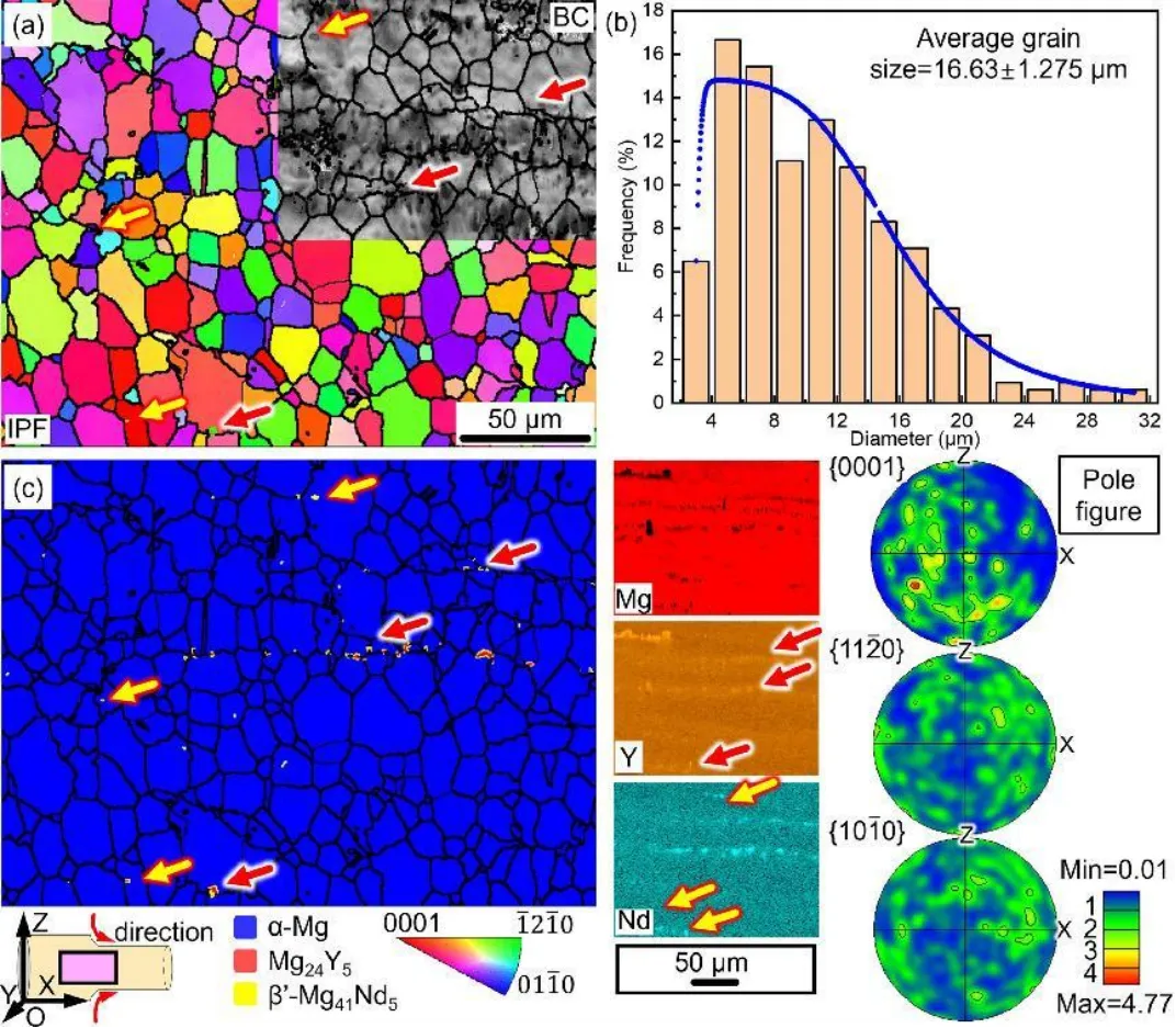 图8 WE43合金在典型挤压状态下:(a)IPF,带有部分BC嵌件;(b)粒度分布;(c)主要元素和PFs的相组成。