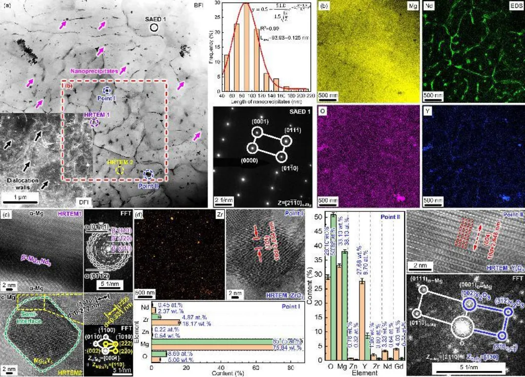 研究发现,该合金塑性变形主要由基面〈a〉和棱柱面〈a〉滑移驱动,变形前为随机织构,变形后晶粒向Z轴排列,最终呈{0001}<10-10>织构取向。微观结构方面,合金晶粒细小,平均尺寸约4.27μm,仅为挤压态的四分之一,主要相有α-Mg、Mg24Y5和β'-Mg41Nd5。除晶界处的纳米β相、半共格Mg24Y5相外,少量纳米ZrO2和Y2O3颗粒也参与强化。经计算,合金强化主要源于沉淀强化(44.41%)、固溶强化(34.06%)和晶界强化(21.53%),其中沉淀强化主要由位错强化(67.77%)主导。