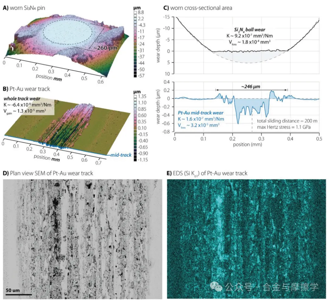Figure 4. Surface topographical area scans of: A) the worn Si3N4 ball and B) the Pt–Au wear track near the end of the track after 100k sliding passes. C) Representative cross-sectional wear depth plots of the ball and Pt–Au wear track. D) Plan-view BSD and E) EDS of the wear track surface.