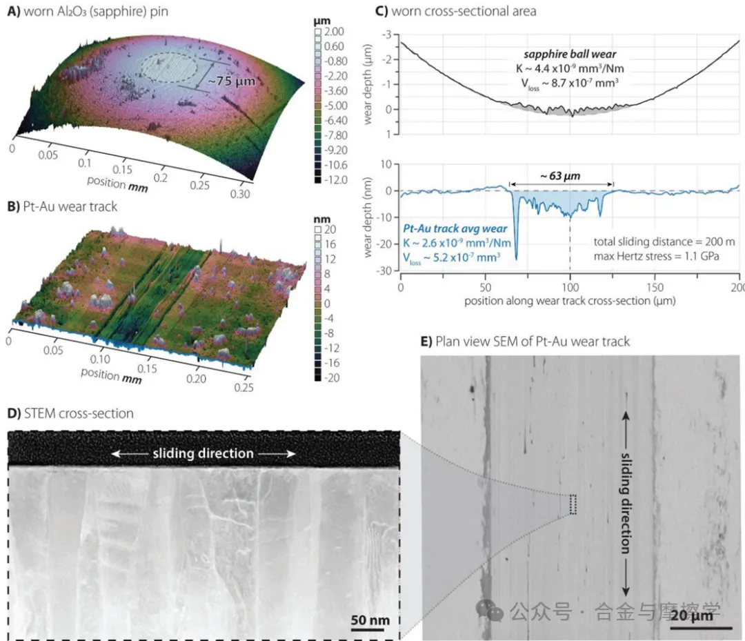 Figure 3. Surface topographical area scans of: A) the worn sapphire ball and B) the Pt–Au wear track near the middle of the track after 100k sliding passes. C) Representative cross-sectional wear depth plots of the ball and Pt–Au wear track. D) Representative cross-sectional STEM inside the wear track. E) Plan-view back-scattered SEM image of wear track where FIB lift-out was taken.