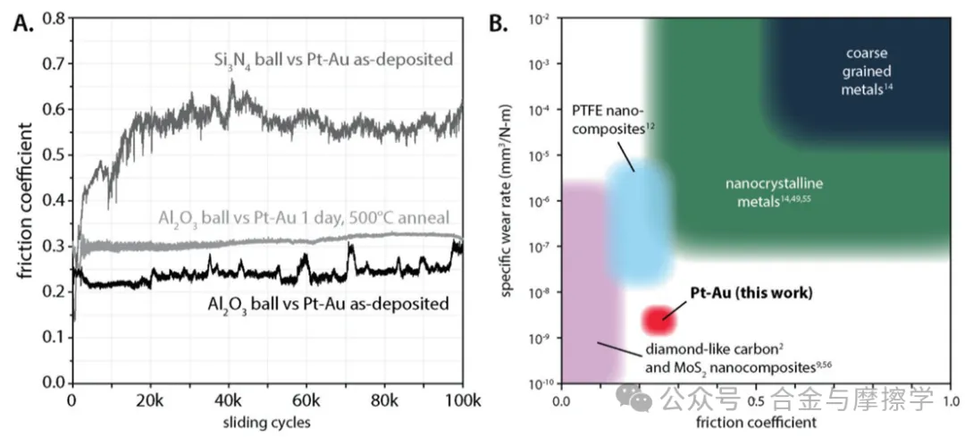 Figure 2. A) Cycle average friction coefficients for sapphire and Si3N4 spheres sliding against Pt–Au films in as-deposited and annealed conditions. B) Friction coefficients and specific or volumetric wear rate map of tribological materials including the present results with Pt–Au sliding against sapphire.