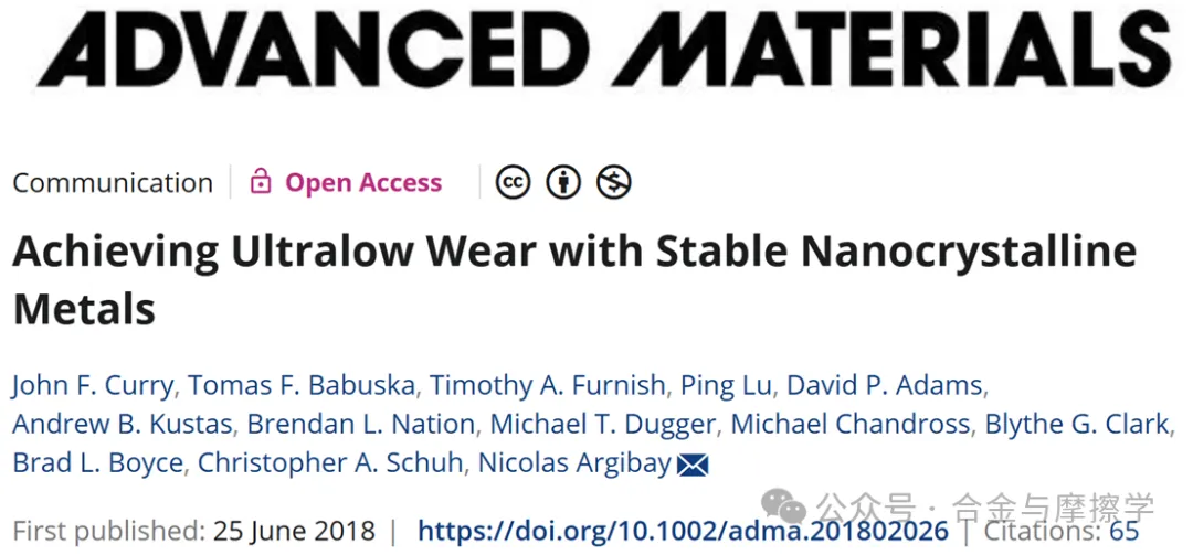 近年来研究发现,通过溶质偏析改变晶界能,可使一些二元合金获得热稳定的纳米晶结构。已有研究展示了这类合金卓越的热稳定性,许多合金在长时间接近熔点温度的环境下,晶粒生长现象极不明显。超低磨损材料通常指磨损率在单原子层量级,即特定磨损率低于10−8 mm3 N−1 m−1的材料。像类金刚石碳(DLC)、石墨、金属二硫化物(如MoS2和WS2 )、金属氮化物、碳化物(如Si3N4和 WC )、半导体(如 GaN)以及部分聚合物纳米复合材料(如 PTFE - 氧化铝)等都属于此类。但金属材料作为一个类别,以往很少能达到超低磨损标准。