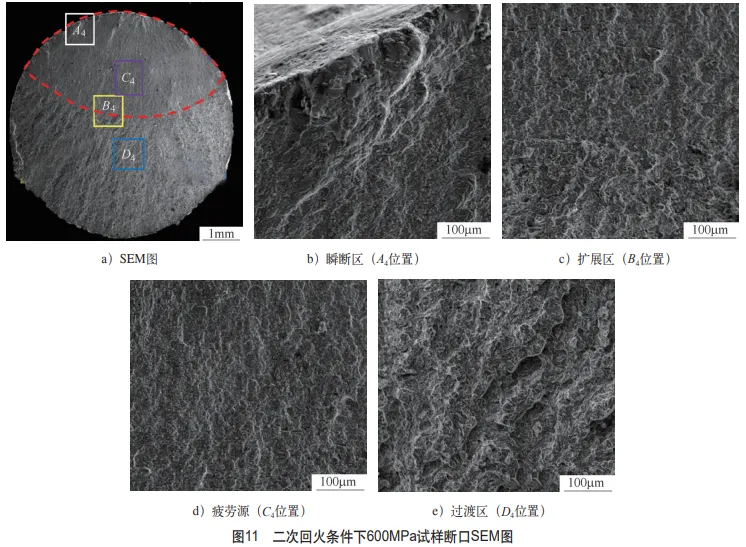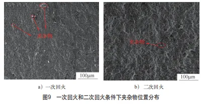 致命元凶:循环应力导致表面微小裂纹→疲劳失效→寿命骤降。行业困境:传统一次回火工艺下,夹杂物尺寸大(15~21μm)、瞬断区面积占比高→裂纹易萌生。破局关键:二次回火工艺优化组织均匀性,显著提升抗疲劳性能!S-N曲线实锤:在600~800MPa高应力下,二次回火试样寿命远超一次回火(见图5)。瞬断区面积减少:DT-800条件下瞬断区占比仅25.1%,抗断裂能力更强(表4)。二次回火后夹杂物平均直径降至10~17μm(一次回火为15~21μm),减少裂纹萌发风险(图9)。SEM图对比:二次回火试样断口“鱼眼”形貌更少,组织分布均匀(图11~13)。基于Tanaka-Akiniwa模型,二次回火后ΔK值更低→应力集中风险下降(表5)。第二次回火:相同参数(560℃×120min)再处理一次。效果验证:硬度487HV,抗拉强度1779MPa,伸长率11.5%。石化装备企业:优先采用二次回火工艺,可延长碟簧寿命,减少停机维修成本。热处理厂:优化控温精度,确保两次回火参数一致,避免组织不均匀。工程师必看:定期检测夹杂物尺寸,结合SEM分析断口形貌,动态调整工艺。注意边界条件:当加载应力<600MPa时,二次回火优势不明显(见图5)。潜在风险:过度回火可能导致硬度下降,需平衡强度与韧性。未来方向:结合AI算法预测最佳回火次数,实现定制化工艺。