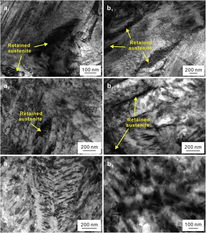 图8. 在不同回火温度下两种轴承钢的透射电子显微镜(TEM)微观结构。RES钢: (a1) 160 °C;(a2) 240 °C;(a3) 420 °C;GER钢: (b1) 160 °C;(b2) 240 °C;(b3) 500 °C。