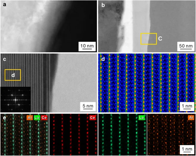 图4. 矩阵与夹杂物之间界面的STEM图像。(a)和(b)分别为GER钢中Al2O3和RES钢中RE2O2S的HAADF图像。(c)和(d)为界面处的高分辨率HAADF-STEM图像,以及(b)和(c)中界面内原子的排列。(e)为稀土元素修饰层的原子尺度EDS映射。(c)中的插图为RES钢中矩阵与夹杂物之间界面的SAED图样。