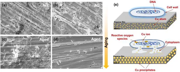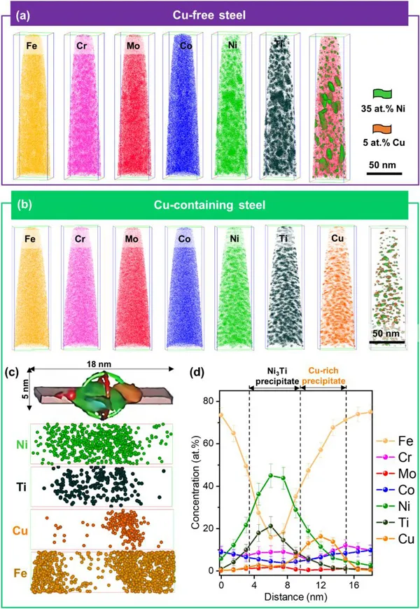 微生物腐蚀(MIC)已成为威胁海洋工程、油气输送和医疗器械等国家重大工程领域装备安全运行的重大挑战。其中,硫酸盐还原菌(SRB)等微生物引发的局部腐蚀因其隐蔽性强、破坏性大等特点,被称为材料失效的“隐形杀手”。在强腐蚀介质、动态载荷与微生物膜协同作用的极端工况下,传统高强钢材料长期面临强度、耐蚀性与抗菌性能难以兼顾的困境。开发兼具超高强度、优异耐蚀性和高效抗菌性能的新型结构材料,已成为国际材料科学领域亟待突破的关键技术难题。针对这一重大需求,中国科学院金属研究所孙成研究员团队联合王威研究员团队及新加坡南洋理工大学Upadrasta Ramamurty教授团队,创新性地提出“析出调控—耐蚀设计—表面功能”三位一体协同设计理念。研究团队通过精确调控Cu元素在钢中的富集行为,成功构建了以Cu富集纳米析出相为核心的“力学性能-耐蚀性-抗菌性”协同增强机制,研制出具有突破性性能的新型超高强纳米析出相强化钢。该材料的创新设计体现在:(1)通过精准的材料设计和热处理工艺,实现Cu元素在钢基体中的纳米级析出相可控分布;(2)利用析出相的弥散强化效应提升材料强度的同时,通过Cu离子的缓释作用赋予材料持久的抗菌性能;(3)通过微观组织结构的优化设计,实现材料强度、耐蚀性和抗菌性能的协同提升。系统的研究表明,富Cu纳米析出相在钢材性能提升中发挥着多重关键作用:首先,持续释放的Cu离子能有效快速杀菌,从而抑制SRB在钢表面的黏附和繁殖;其次,纳米析出相的弥散分布使钢材获得高达1.8 GPa的抗拉强度,同时保持优异的耐蚀性能。在模拟SRB腐蚀环境的加速试验中,新型钢材的腐蚀速率较对照组(未含铜纳米析出相)降低约14倍,展现出卓越的抗局部腐蚀能力。研究还建立了析出相结构调控与抗菌/耐蚀机制的定量关系模型,阐明了Cu富集纳米析出相通过调控材料表面微区电化学环境,实现抑制生物膜形成和延缓腐蚀进程的协同作用机理。这一成果不仅解决了超高强钢在微生物腐蚀环境中性能失衡的技术瓶颈,更为设计开发新一代多功能结构材料提供了重要的理论指导和工程借鉴。相关研究成果以“Cu-rich nano precipitates simultaneously enhance the tensile properties,antibacterial efficacy,and corrosion resistance of ultra-high strength steel”为题,发表于金属材料科学领域著名期刊《Acta Materialia》。金属研究所韦博鑫副研究员和牛梦超项目研究员为论文共同第一作者,金属研究所王威研究员、湘潭大学吴堂清教授和新加坡南洋理工大学Upadrasta Ramamurty教授担任共同通讯作者。本研究获得了国家自然科学基金和新加坡科学、技术和研究局结构金属合金项目的资助支持。该技术的工程化应用将为我国重大基础设施的长期安全服役提供重要的材料保障。图1. 钢中Ni₃Ti与富Cu析出相的原子探针层析(APT)三维重构分析图4. 钢在SRB接种溶液中浸泡14天后的腐蚀失重结果